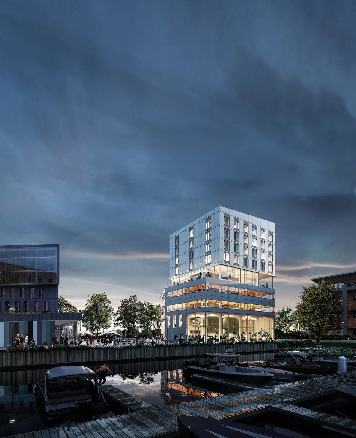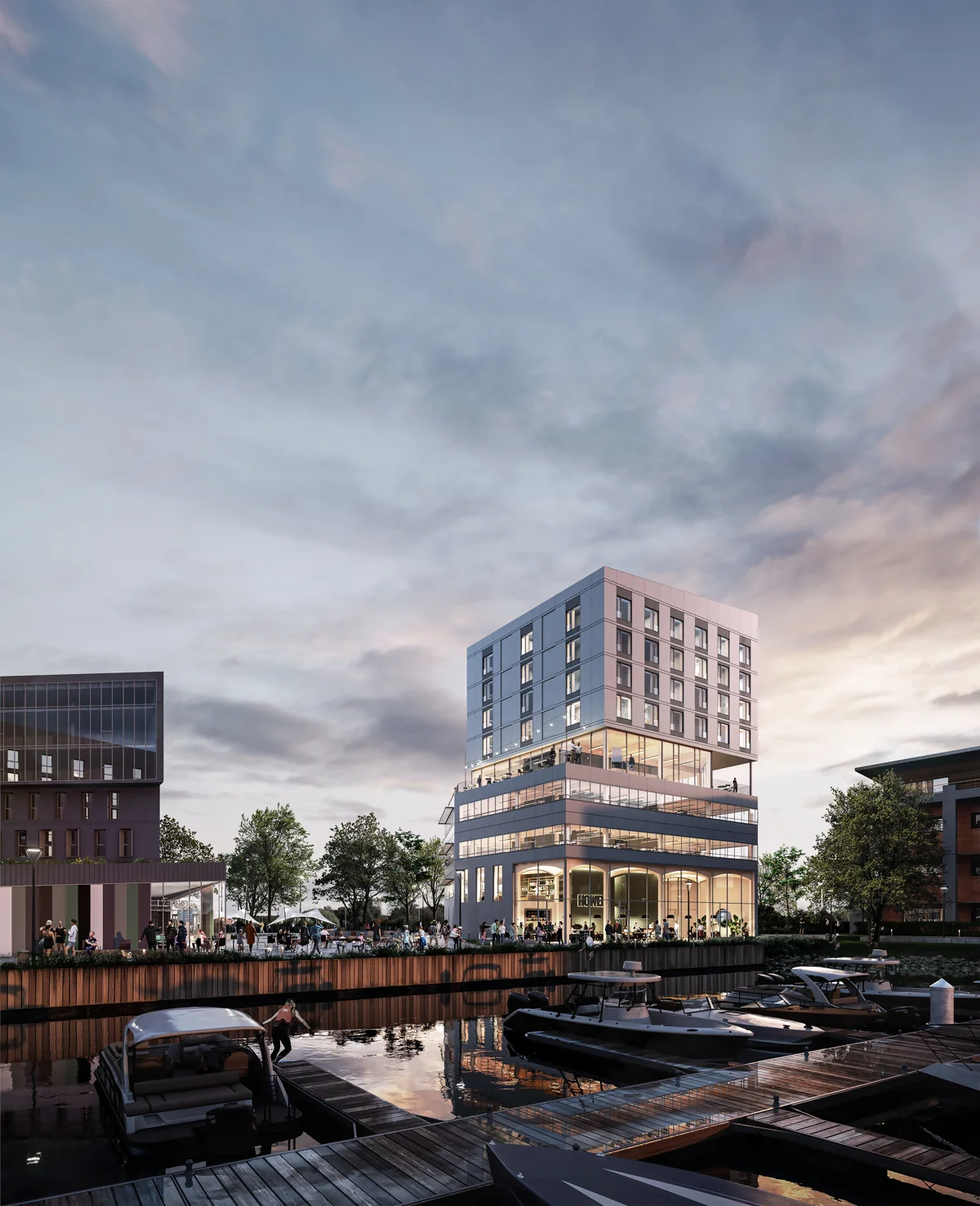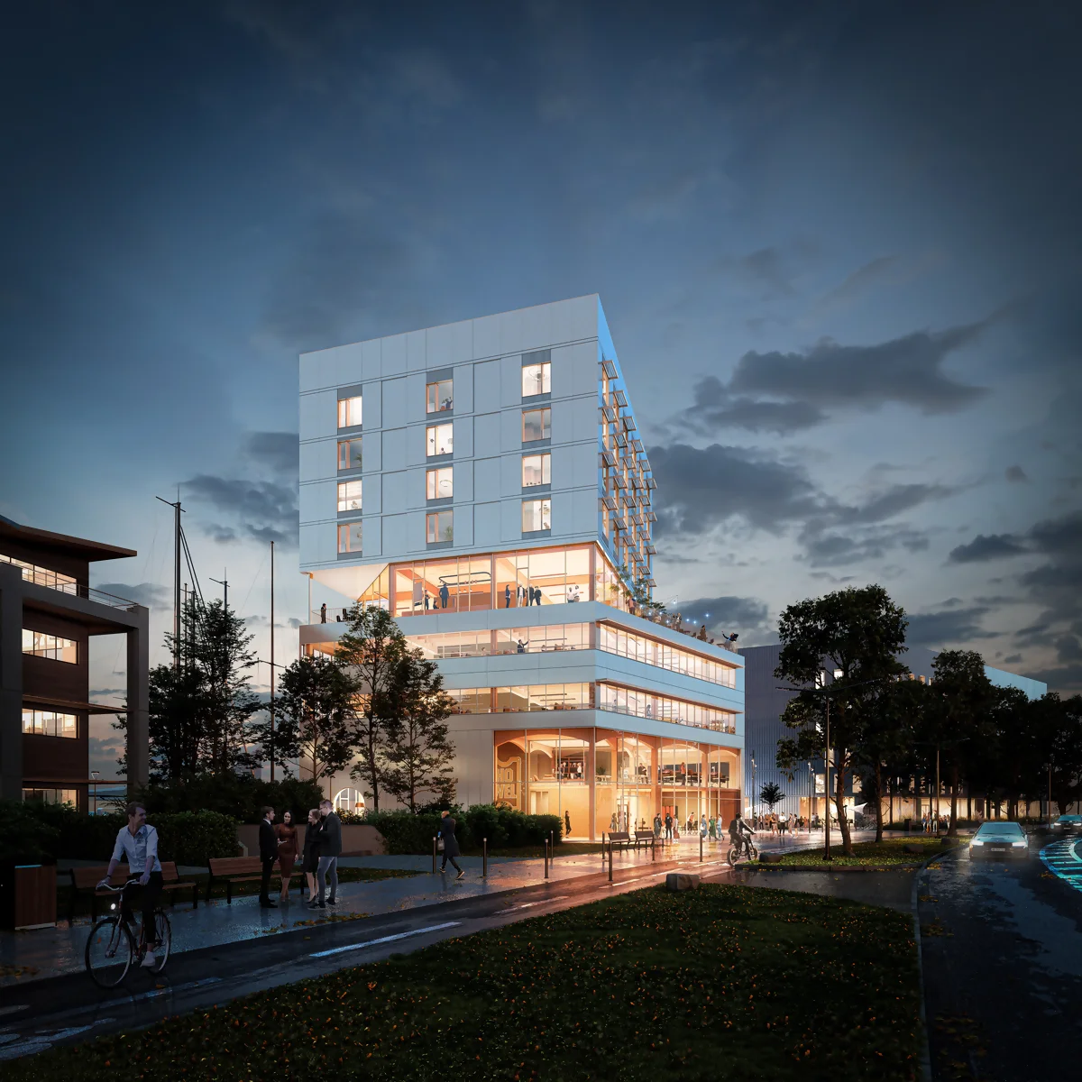 Pour mettre en scène la vie du bâtiment, nous avons réalisé des rendus en ambiance crépusculaire, jouant avec la lumière intérieure pour révéler les volumes, l’atmosphère chaleureuse des bureaux et l’énergie qui s’en dégage à la tombée du jour.